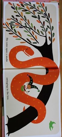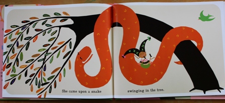 There is something that hints of folk art in the illustrations. The loud colors complement the distinct shapes, and I really like the bright, pop-art feel that accompanies the story. The echoing concentric circles behind the little girl made it feel as if her voice was bouncing off the pages. I could practically hear her shrieking in delight. There is a lot of movement suggested in these striking images.