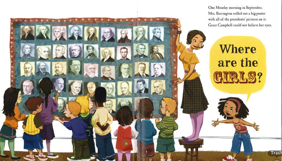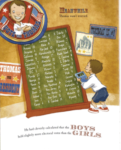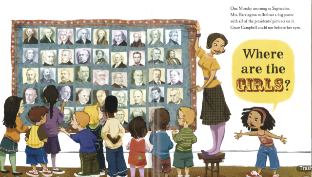 “Where are the GIRLS?” she asks, horrified to discover that the United States has never had a woman president. Clearly a woman of action, Grace announces that she would like to be president. Some of the class laughs, but Mrs. Barrington, inspired by the idea, decides that the class will have an election. Thomas Cobb (white, All-American Golden Boy) will run against her. The other students are assigned a state, and the corresponding number of electoral votes, and Grace and Thomas begin campaigning. Both strong candidates (promising things like anti-bullying campaigns, free tutoring and better hot lunch), Thomas feels he has the election locked up since the boys have slightly more electoral votes than the girls (ahem, entitlement and male privilege)