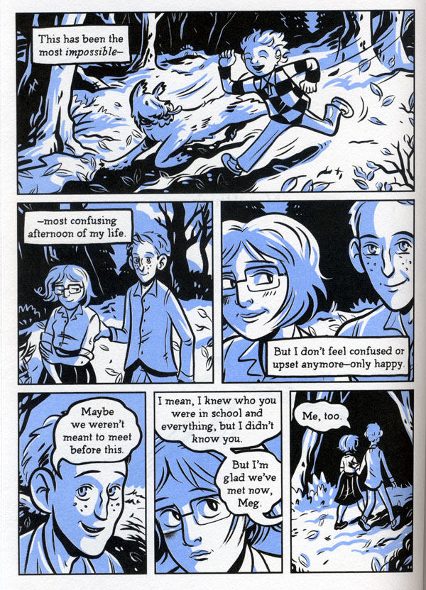 Larson does a great job of balancing when to condense and use visuals to tell this story, and when to use the words straight out of the source text. The power of the friendship / emerging romance between Meg and Calvin is served really well by this adaptation. Look at the subtleties of their expression captured in this panel. I love how much these characters provide balance for each other.*