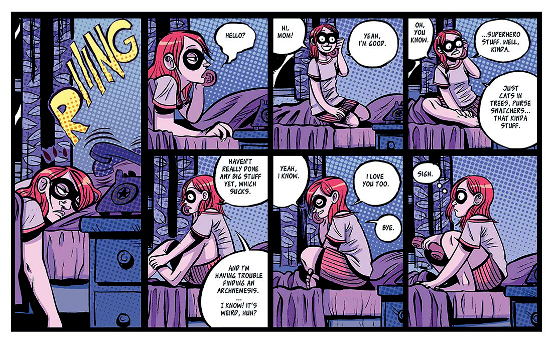 Superhero Girl is very much a normal young adult. She’s living with a roommate to cut costs. She doesn’t make enough money doing what she loves. And she is constantly being compared to her more successful older sibling, which drives her bonkers. It doesn’t help that her roommate just got a great new boyfriend, making Superhero Girl feel like a permanent third wheel. Superhero Girl’s life situation and social obstacles are much more in line with the “new adult” crowd – those in the 18 to 24 year old range. I definitely appreciated the book because Superhero Girl’s problems are familiar to me. I think that middle school and high school girls will also love Superhero Girl and her awkwardness, but her life experiences may seem distant for those readers. Still, girls who have grown up from reading Raina Telgemeier’s Smile and Drama may be yearning for something similar but more mature. The Adventures of Superhero Girl is definitely the book for them.